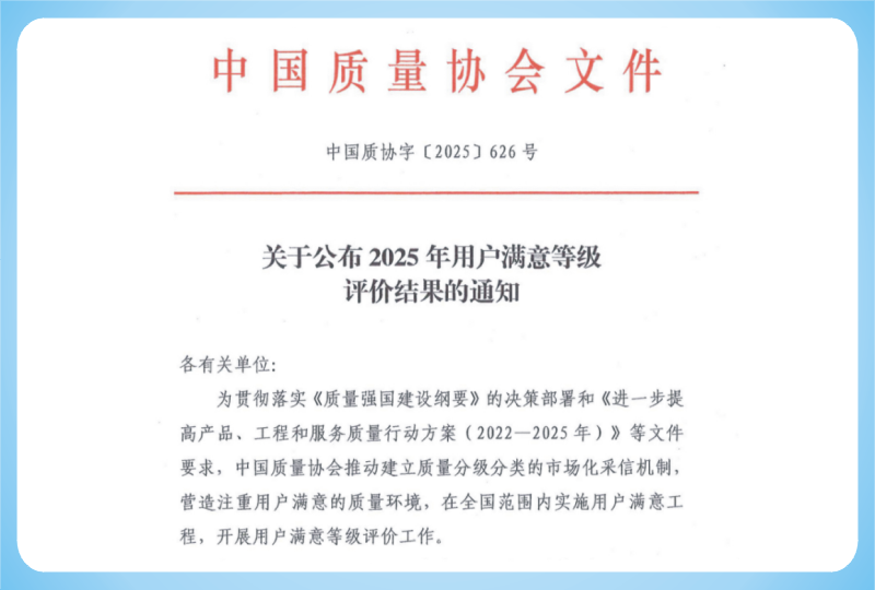 近日,中国质量协会公布《2025年用户满意等级评价结果》,公司凭借对产品品质的精益求精与客户服务的不断精进,荣获全国用户